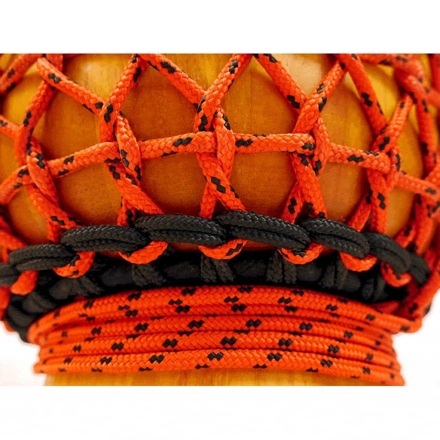 The newest addition to Dancing Drum's line of Signature Series djembes, the Pro-Series Djembe features a tightly mounted, unbleached calfskin drum head, red non-stretch vertical tuning ropes, double-looped ring ropes, a hand-rubbed finish, and a gold tacks in a zig-zag pattern for some additional bling!